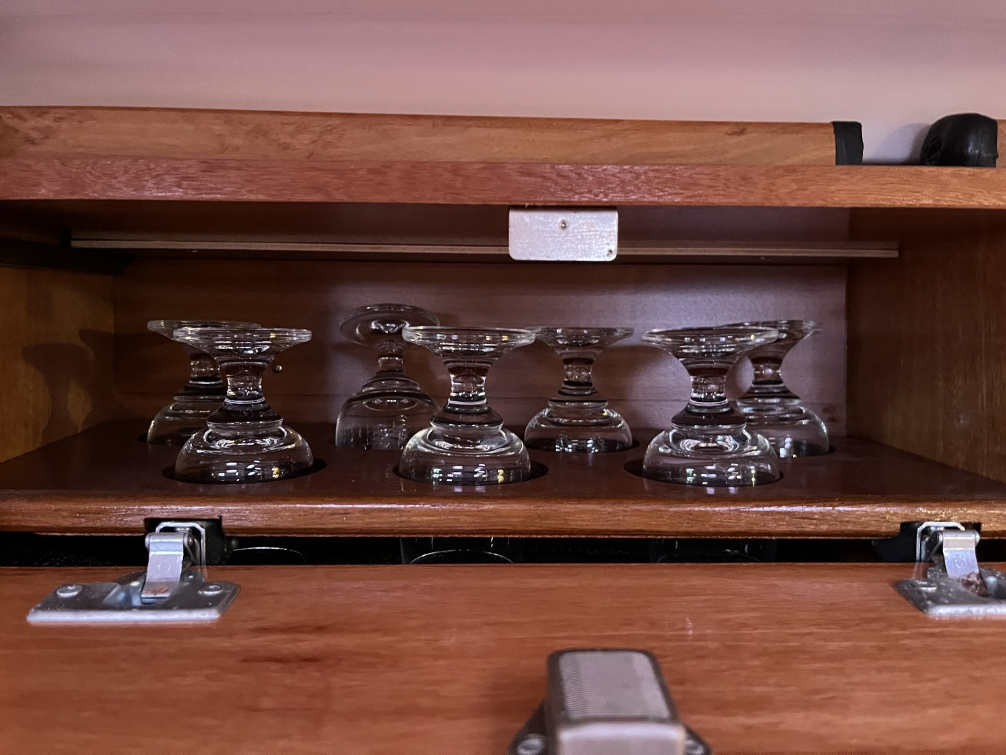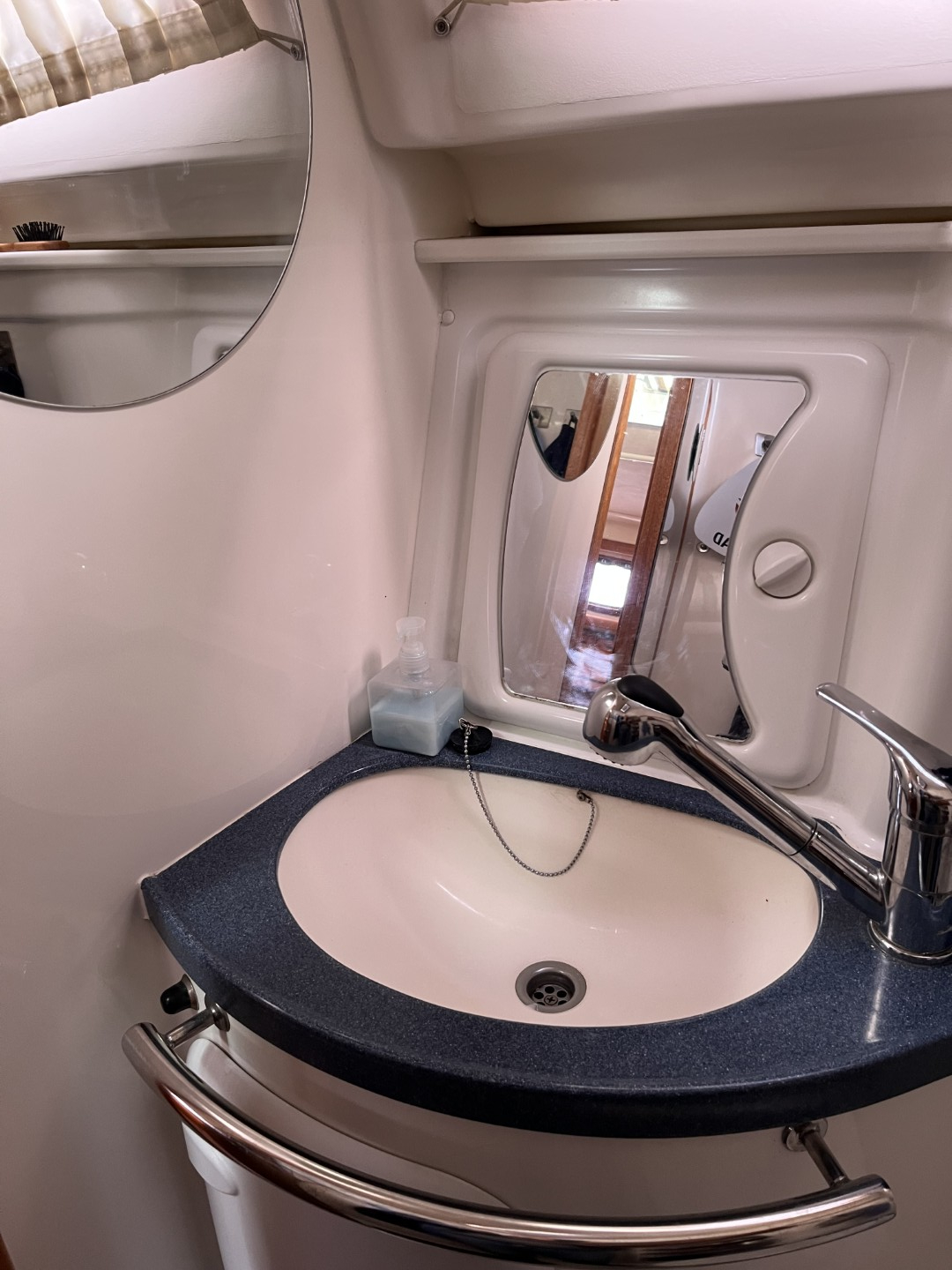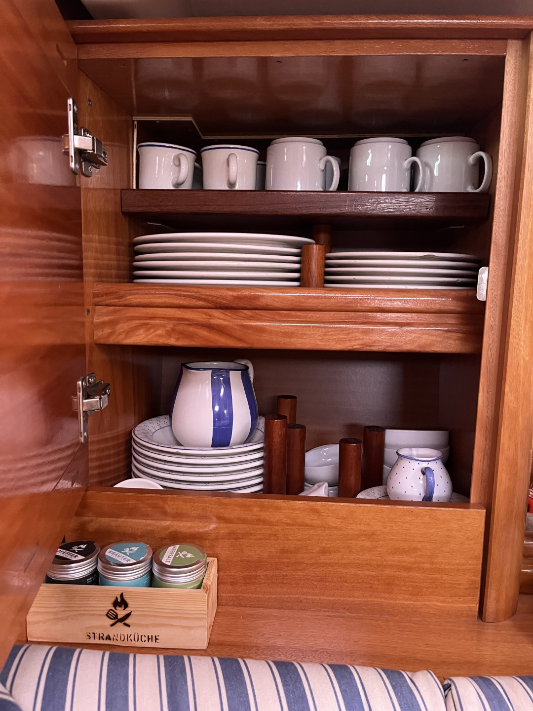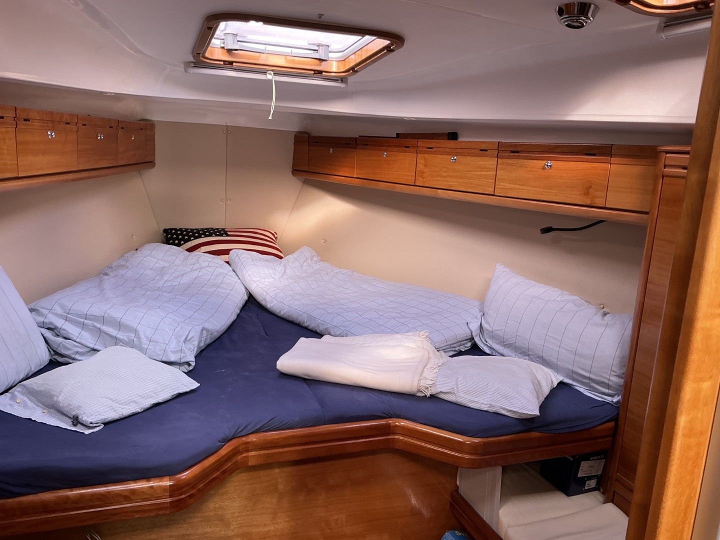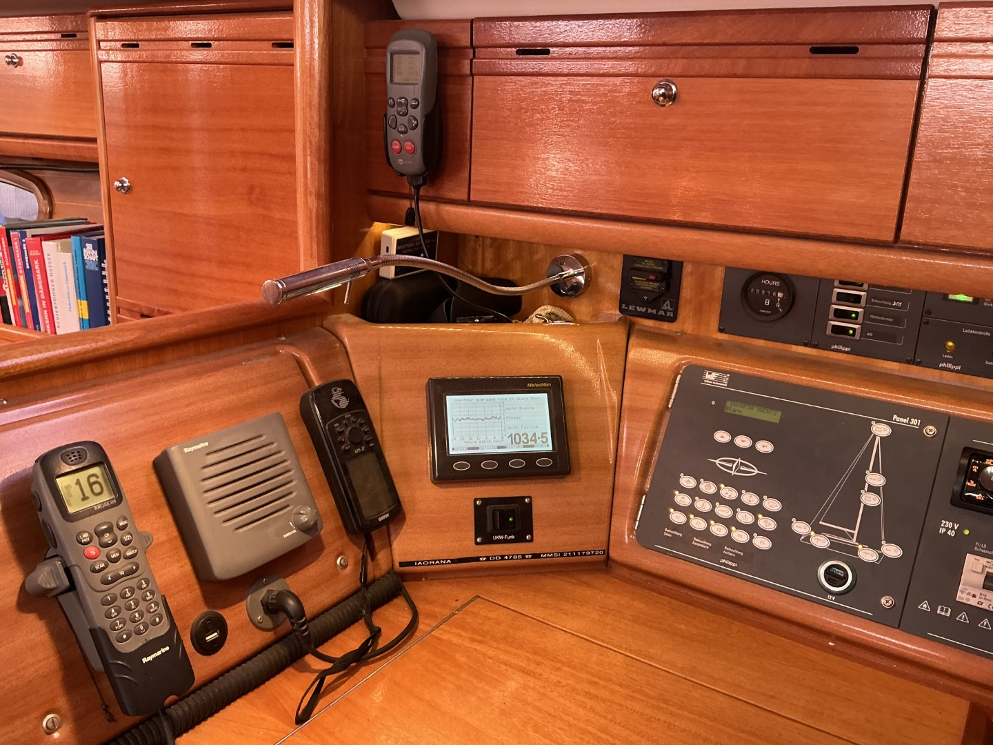 Extra Einbauten im Bad, Zusatzfenster Achterkajüte, Ablagen optimiert, Zusatzbeleuchtung Achterkoje, Naviplatz und Panty. Leselampen mit USB-Anschluss Vorschiff und Achterkoje.