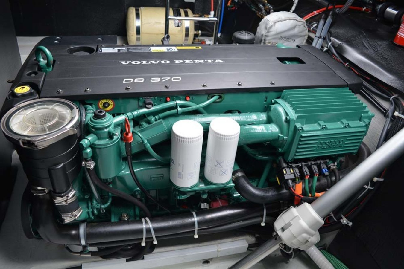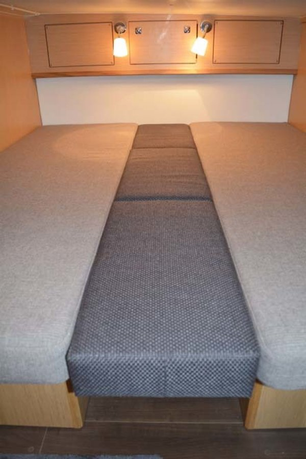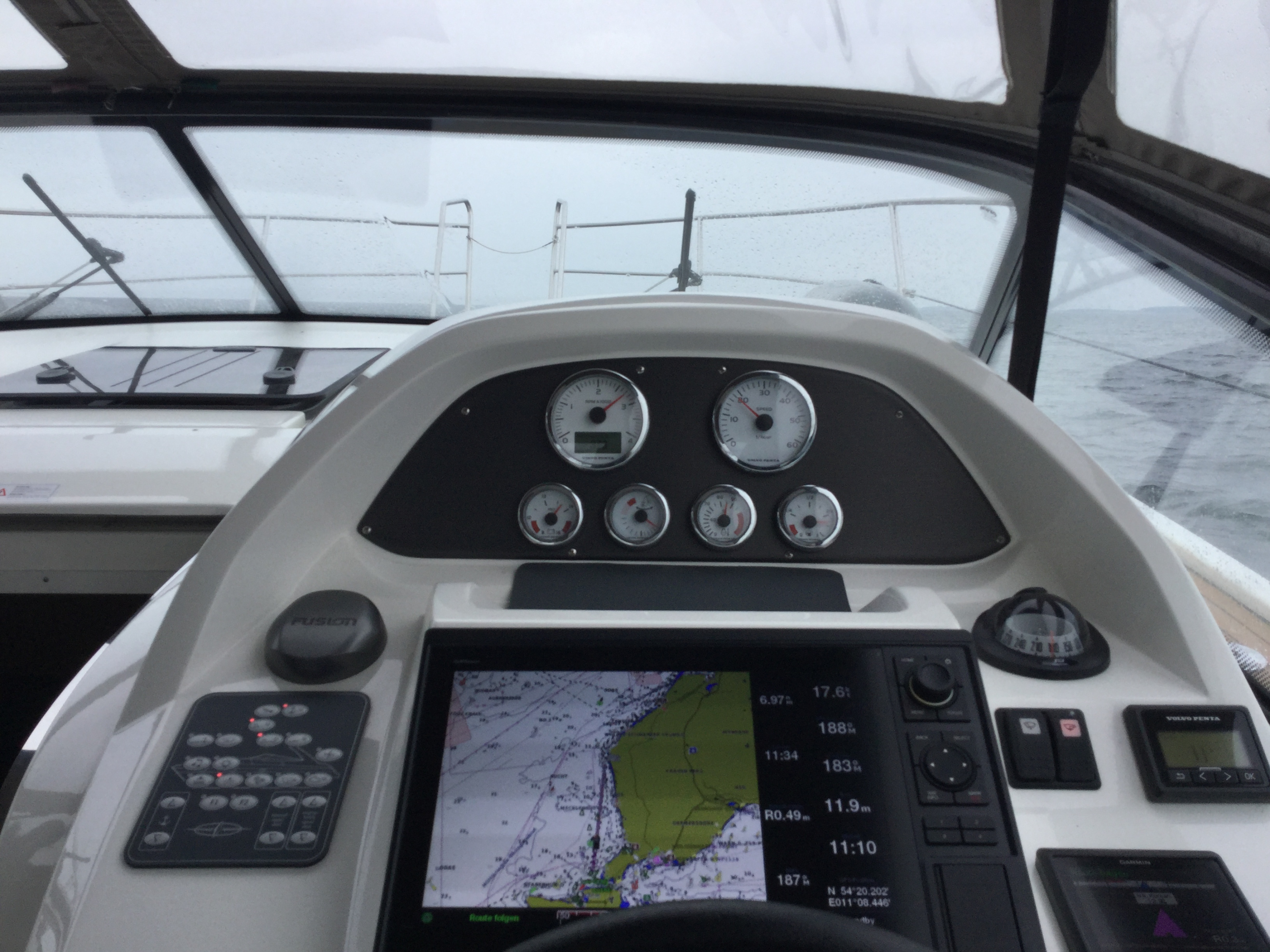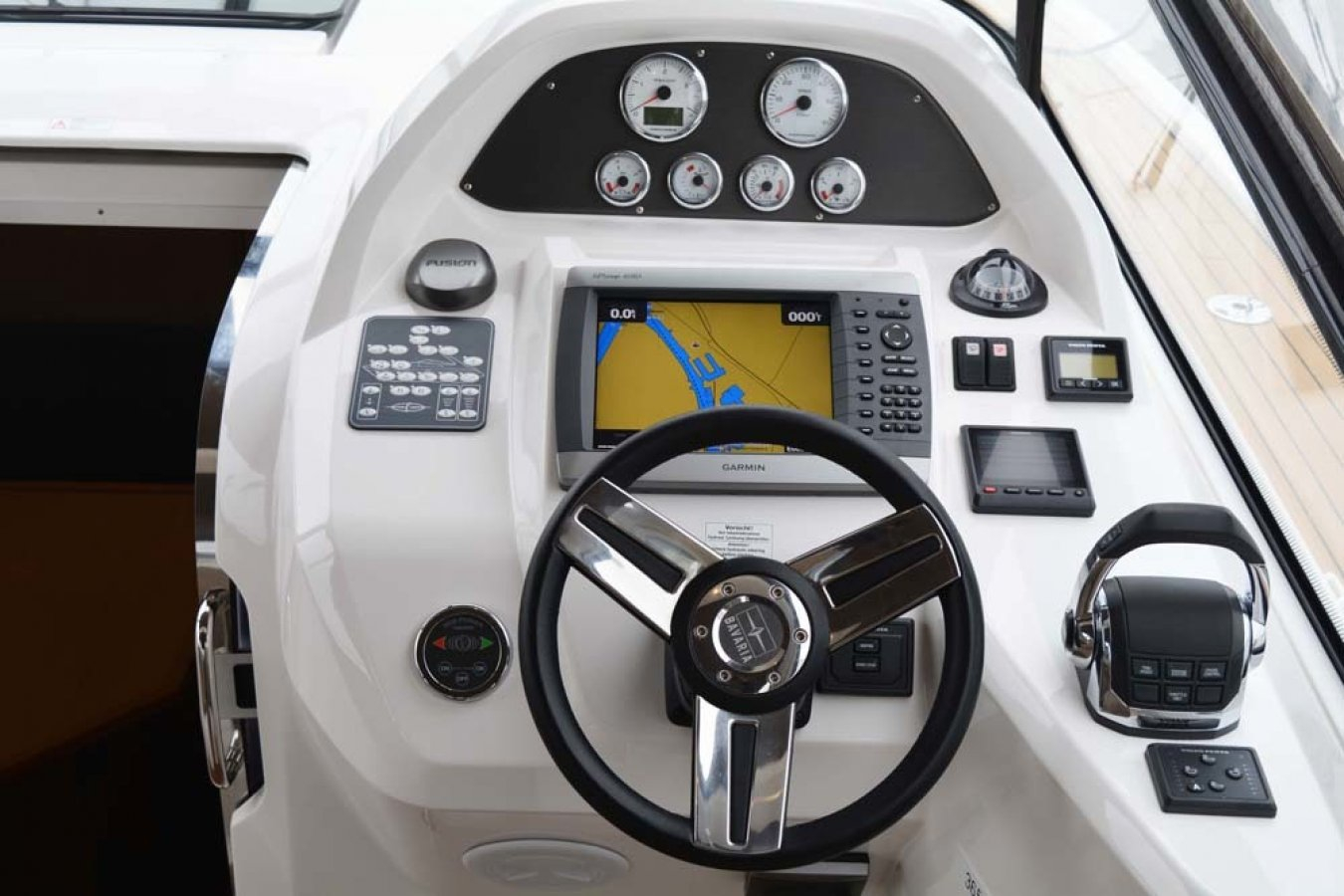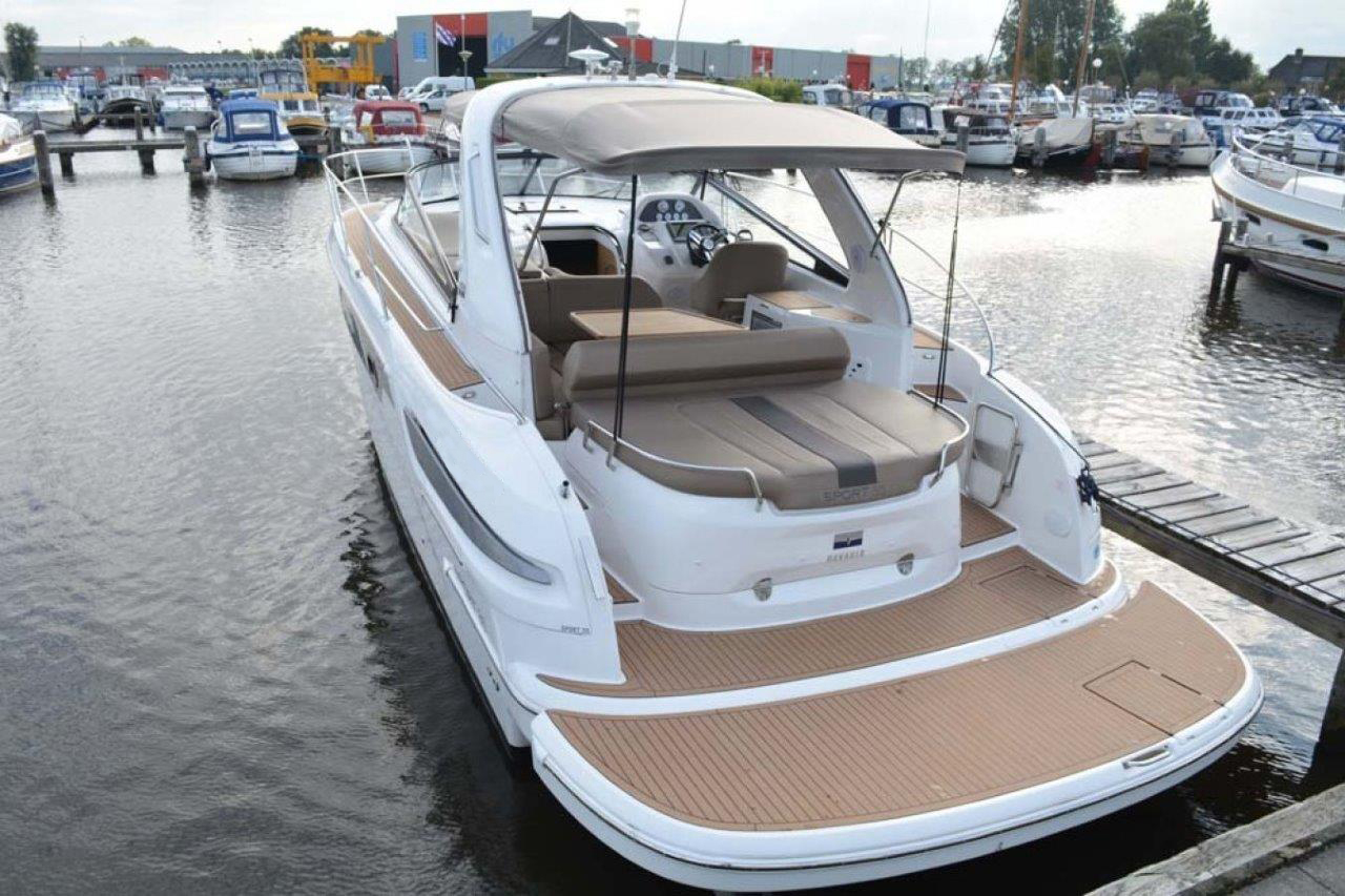 Bavaria Sport 35 in sehr gepflegtem Zustand. 2 Doppelkabinen. Volvo-Penta D6-370 PS Dieselmotor mit nur 575 Std., Duoprop-Antrieb, zusätzlich isolierter Motorraum, Bugstrahler, elektrische Ankerwinsch, verlängerte Badeplattform, luxuriöse „Suntex“-Außenpolsterung, schöne Cockpit-Persenning (teils neue Scheiben 2025), 2x Scheibenwischer mit