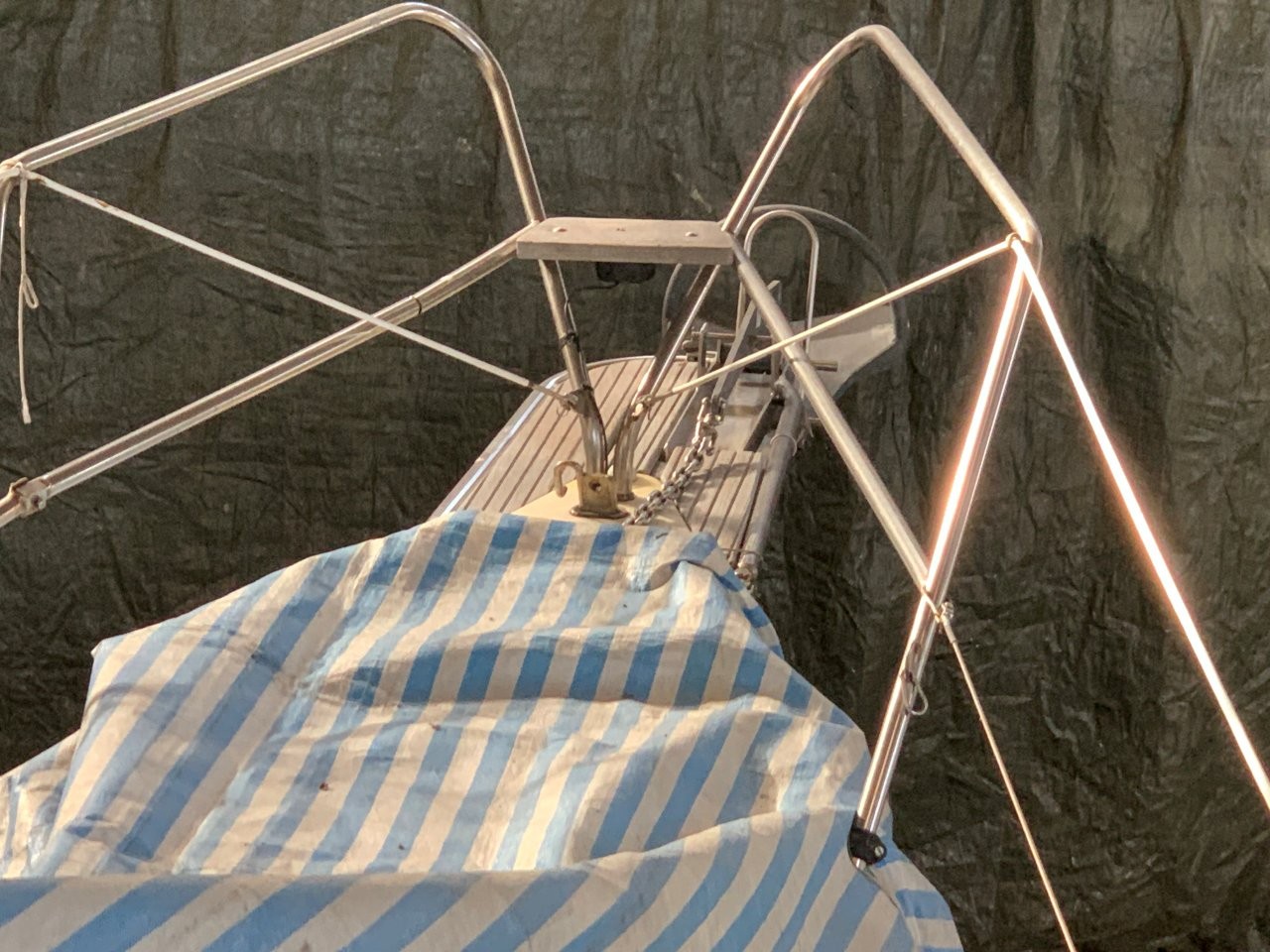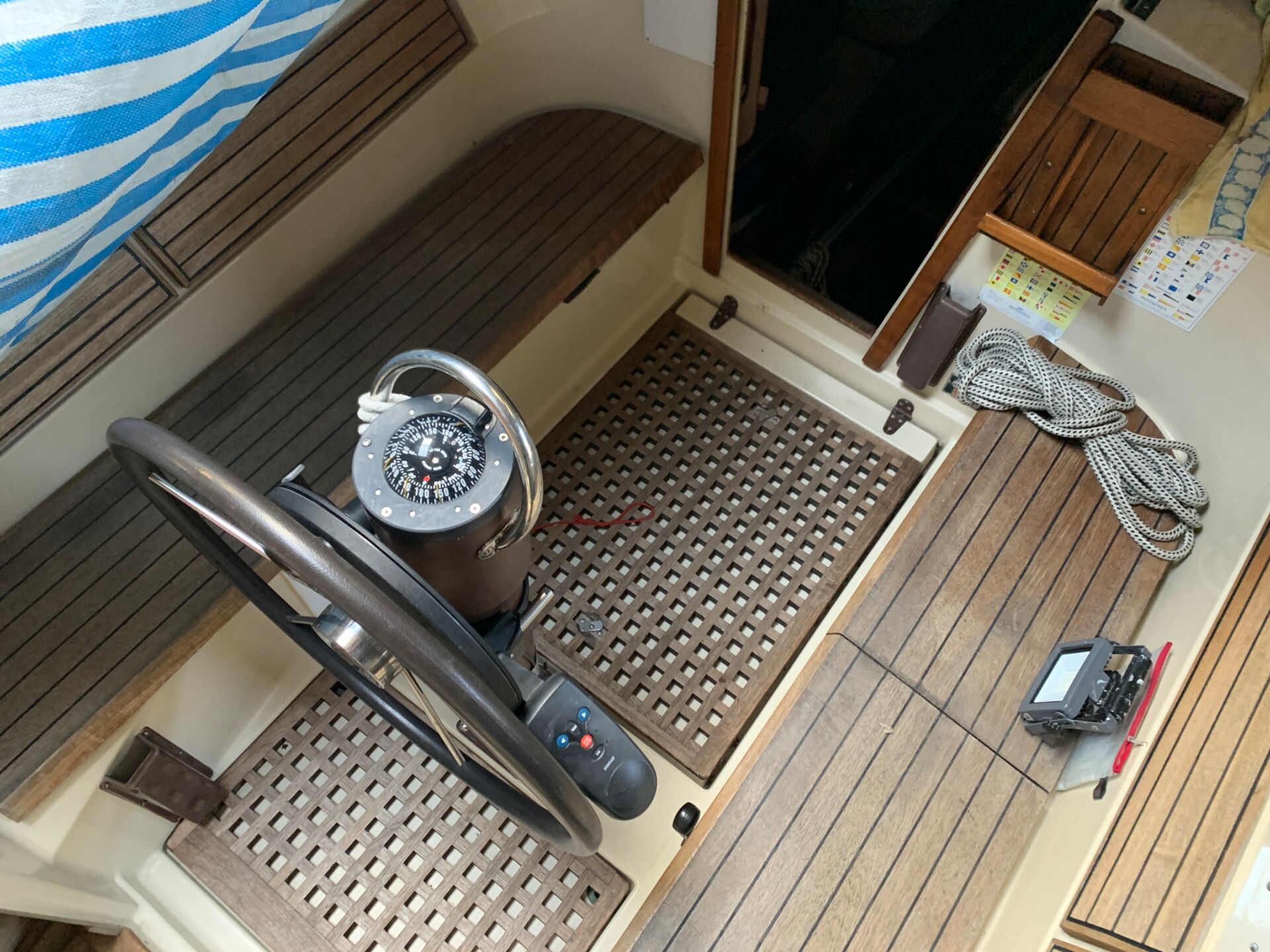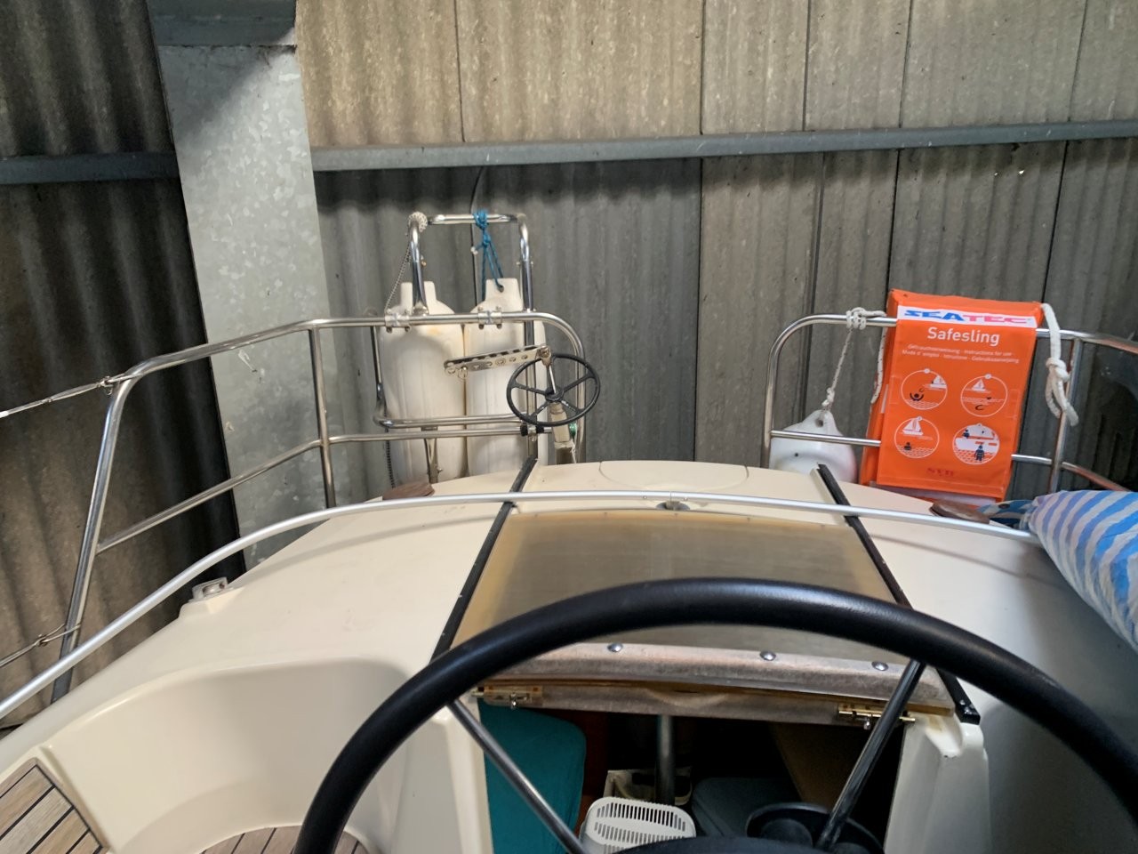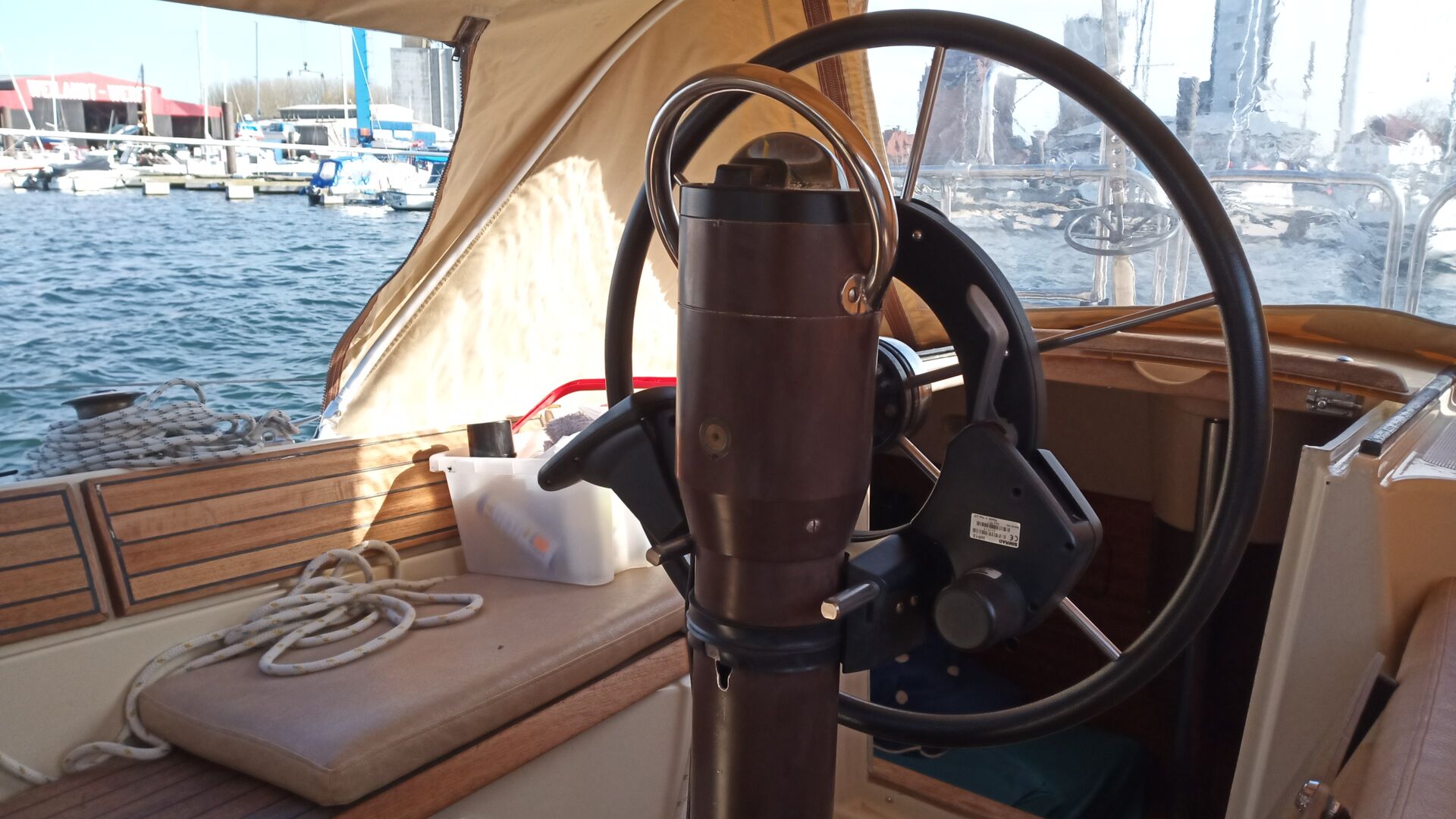 Sprayhood mit einteiliger Scheibe und Cockpitzelt. Rumpffenster. Bugspriet mit Ankerrolle und Rocna Anker 10 Kg erneuert. Schönes Teakholz im Cockpit. Stecktaue an Deck.